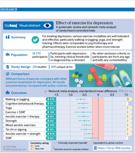A comprehensive review published in the BMJ examined the effect of exercise for depression through a systematic review and network meta-analysis of randomized controlled trials. The study included 218 unique trials with over 14,000 participants, comparing various forms of exercise with standard treatments and control conditions. The findings indicate that exercise significantly reduces symptoms of depression, with particular benefits observed in walking or jogging, yoga, and strength training.